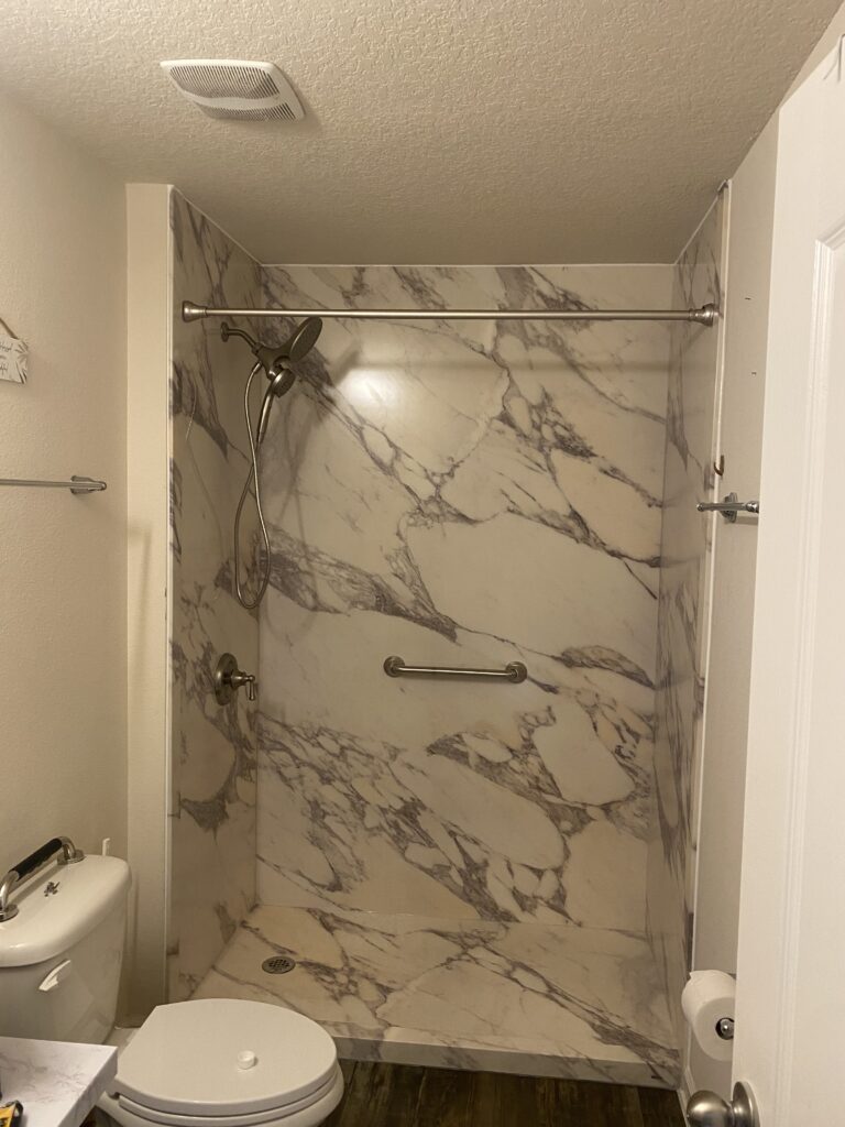Installation of a 3-Wall Acrylic Wetspace with Curtain Rod, providing a clean and waterproof surface. Addition of a stainless steel grab bar for enhanced accessibility. Concrete removal and re-pour to level and strengthen the foundation.